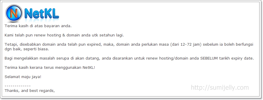 Boleh tak, lupa semalam 10.06.2013 kene renew hosting sumijelly.com ni... hahahaha